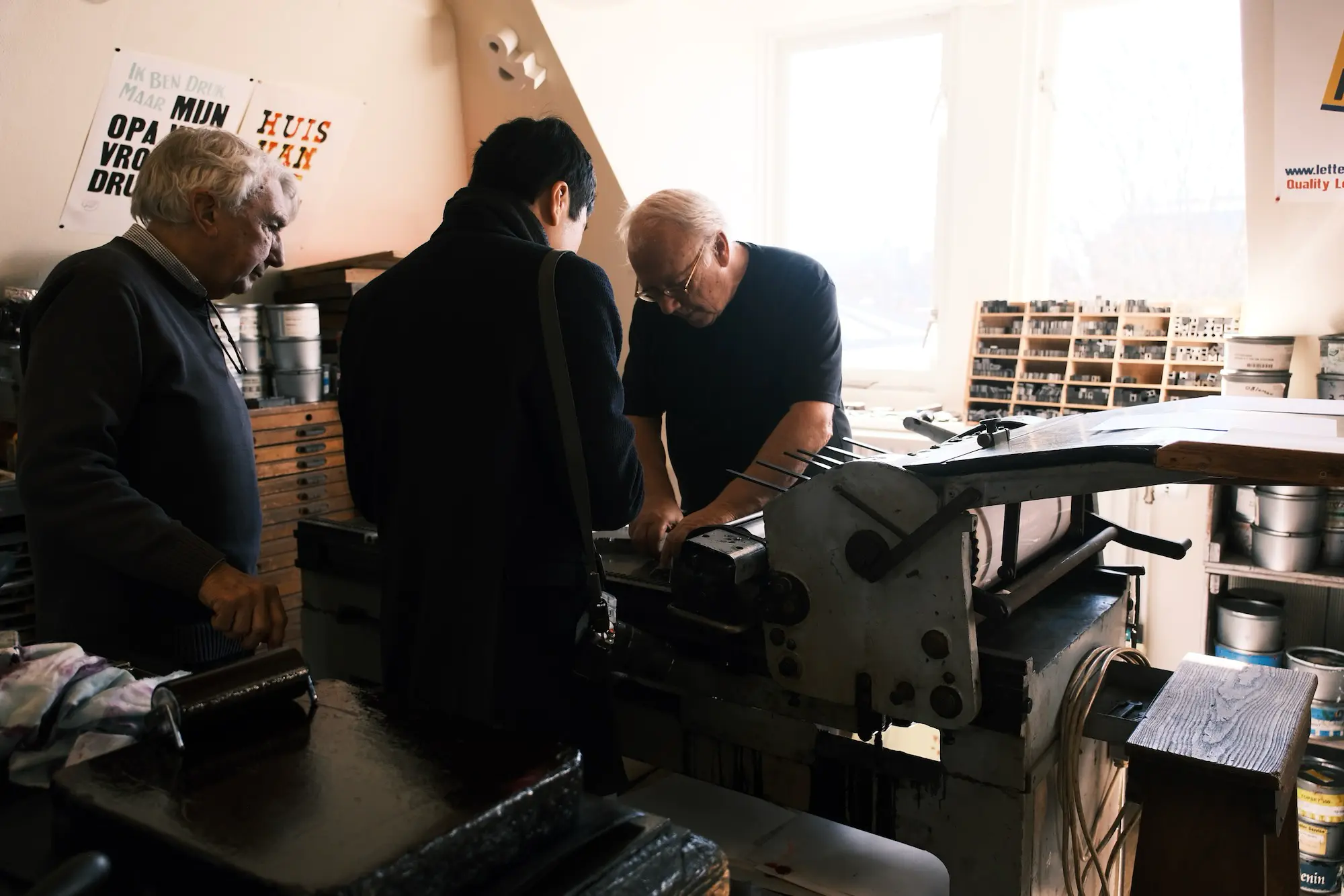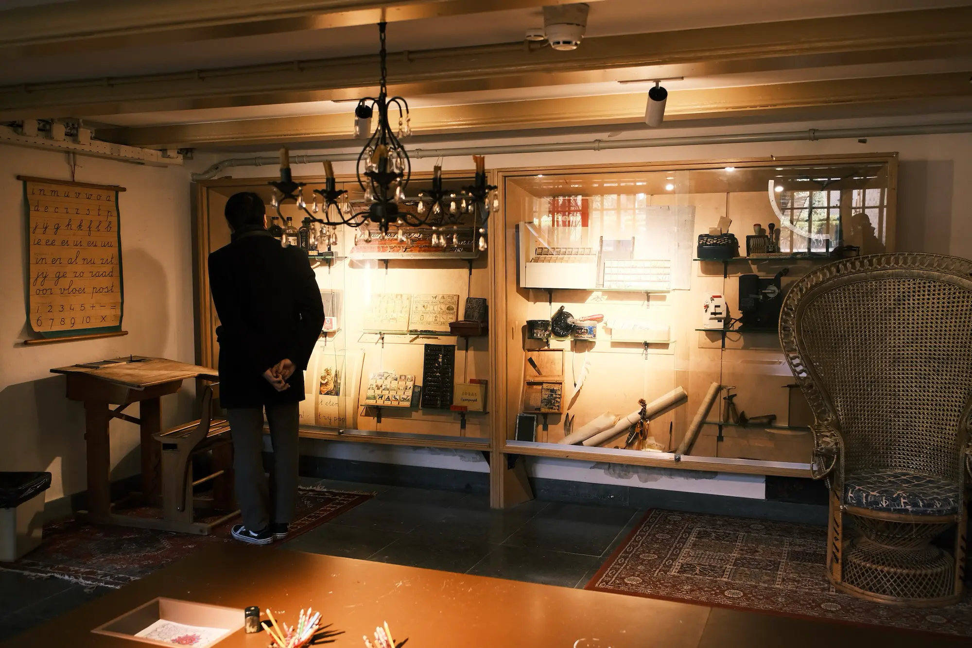 カンファレンスが開けた3日目は大曲さんと街を散策した。コーヒーを飲んだ後、広場で鳥を撮ったり、Underwareのメンバーの図書館に伺ったり、rijksmuseum Huis van het Boekという本の博物館に行ったり。そこでは写本や活版印刷といったベーシックなものから、オランダの教育現場で文字を書くのに使われた道具の紹介などもあって楽しかった。最上階が活版印刷工房となっており、書体を選ばせてもらって刷っていただいたりもした。